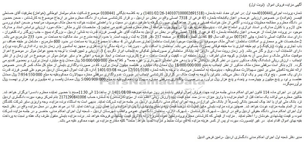 شعبه صادر کننده:شعبه اول اجرای احکام مدنی دادگستری شهرستان اردبیل/قدیم