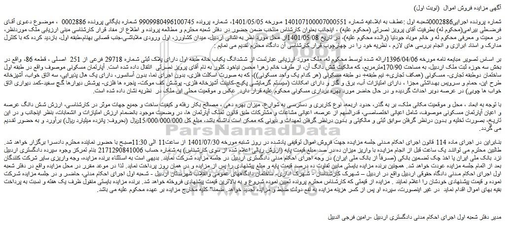 شماره پرونده اجرایی0002886شعبه اول :عطف به ابلاغیه شماره 140107100007000551 مورخه 1401/05/05، شماره پرونده 9909980496100745 شماره بایگانی پرونده 0002886 ، موضوع دعوی آقای فرضعلی بیرامی(محکوم له) بطرفیت آقای پرویز نصرتی (محکوم علیه) ، اینجانب بعنوان کارشناس منتخب ضمن حضور در دفتر شعبه محترم و مطالعه پرونده و اطلاع از مفاد قرار کارشناسی مبنی ارزیابی ملک موردنظر، در معیت و معرفی محکوم له و خانم موباه جودنیا (والده محکوم علیه)، در تاریخ 1401/05/08از محل مورد نظر به نشانی اردبیل، میدان کشاورز، اول ورودی ملاباشی،جنب قصابی بهنام،طبقه اول، بازدید کرده که با کنترل مدارک و اسناد ابرازی و انجام بررسی های لازم ، نظریه خود را در چهارچوب قرار کارشناسی آن دادگاه محترم تقدیم می نمایم :
