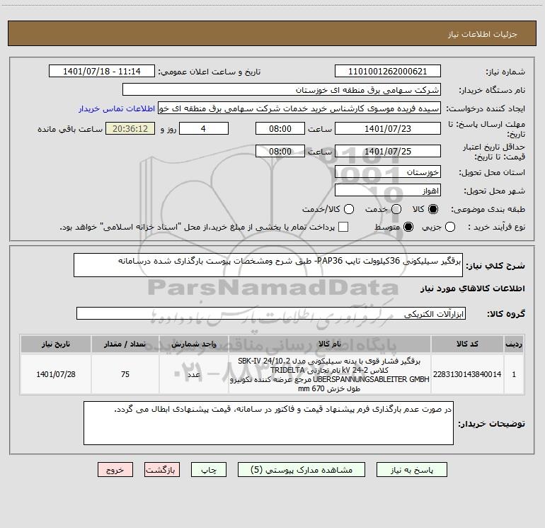 شرح کلی نیاز: برقگیر سیلیکونی 36کیلوولت تایپ PAP36- طبق شرح ومشخصات پیوست بارگذاری شده درسامانه