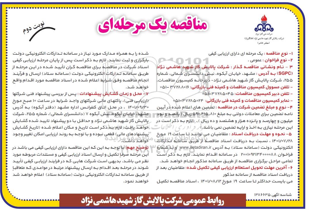 7- محل و زمان گشایش پیشنهادات پس از بررسی پیشنهاد فنی شرکتها ارزیابی فنی پاکتهای مالی شرکتهای واجد شرایط در ساعت 10 صبح مورخ 1401.9.30 در محل اتاق کنفرانس اداره مشهد دفتر ابکوه به ادرس مشهد خیابان ابکوه نبش آبکوه 7 دانشسرای شمالی شماره 255 شرکت پالایش گاز شهید هاشمی نژاد حداقل به سه پیشنهاد تایید شده گشایش خواهد یافت. لازم به ذکر است تاریخ و مکان اعلام شده تاریخ گشایش پیشنهادهای مالی قطعی نبوده و با توجه به روند ارزیابی امکان تغییر وجود خواهد داشت