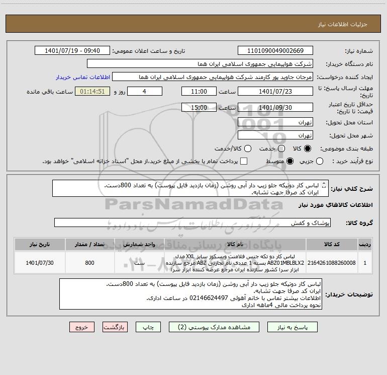 شرح کلی نیاز: لباس کار دوتیکه جلو زیپ دار آبی روشن (زمان بازدید فایل پیوست) به تعداد 800دست. ایران کد صرفا جهت تشابه. اطلاعات بیشتر توضیحات مطالعه شود.