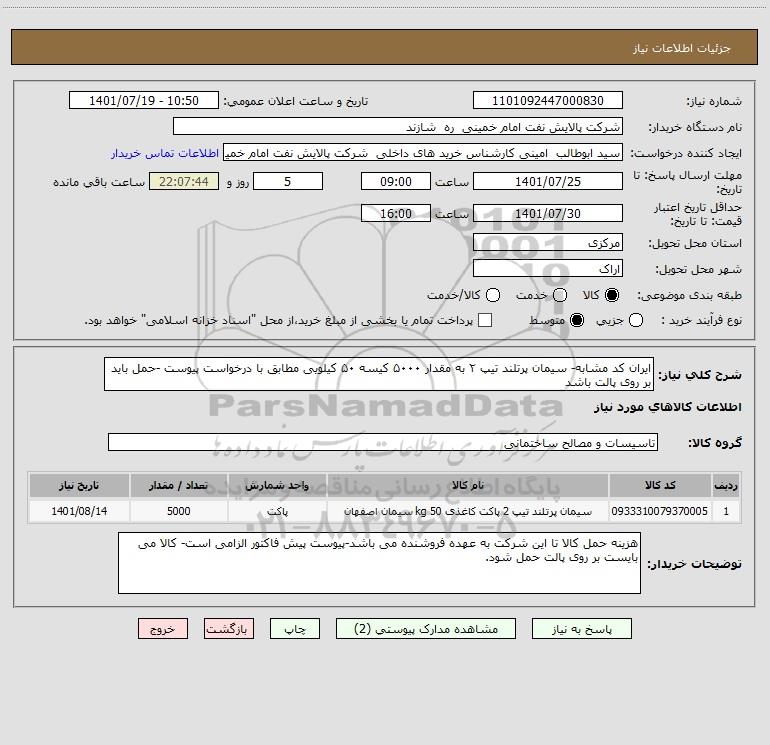 شرح کلی نیاز: ایران کد مشابه- سیمان پرتلند تیپ ۲ به مقدار ۵۰۰۰ کیسه ۵۰ کیلویی مطابق با درخواست پیوست -حمل باید بر روی پالت باشد