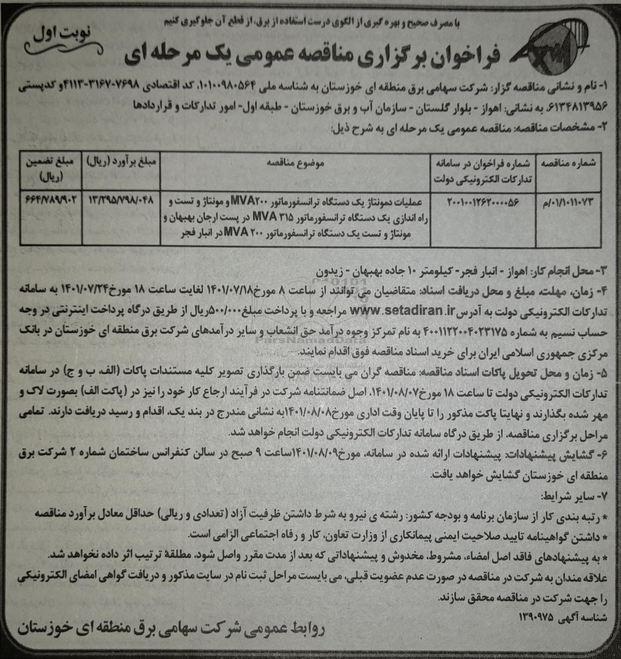 1- نام و نشانی مناقصه گزار شرکت سهامی برق منطقه ای خوزستان به شناسه ملی 10100980564 کد اقتصادی 41130316707698 و کد پستی 6134813956 به نشانی: اهواز - بلوار گلستان - سازمان آب و برق خوزستان - طبقه اول امور تدارکات و قراردادها