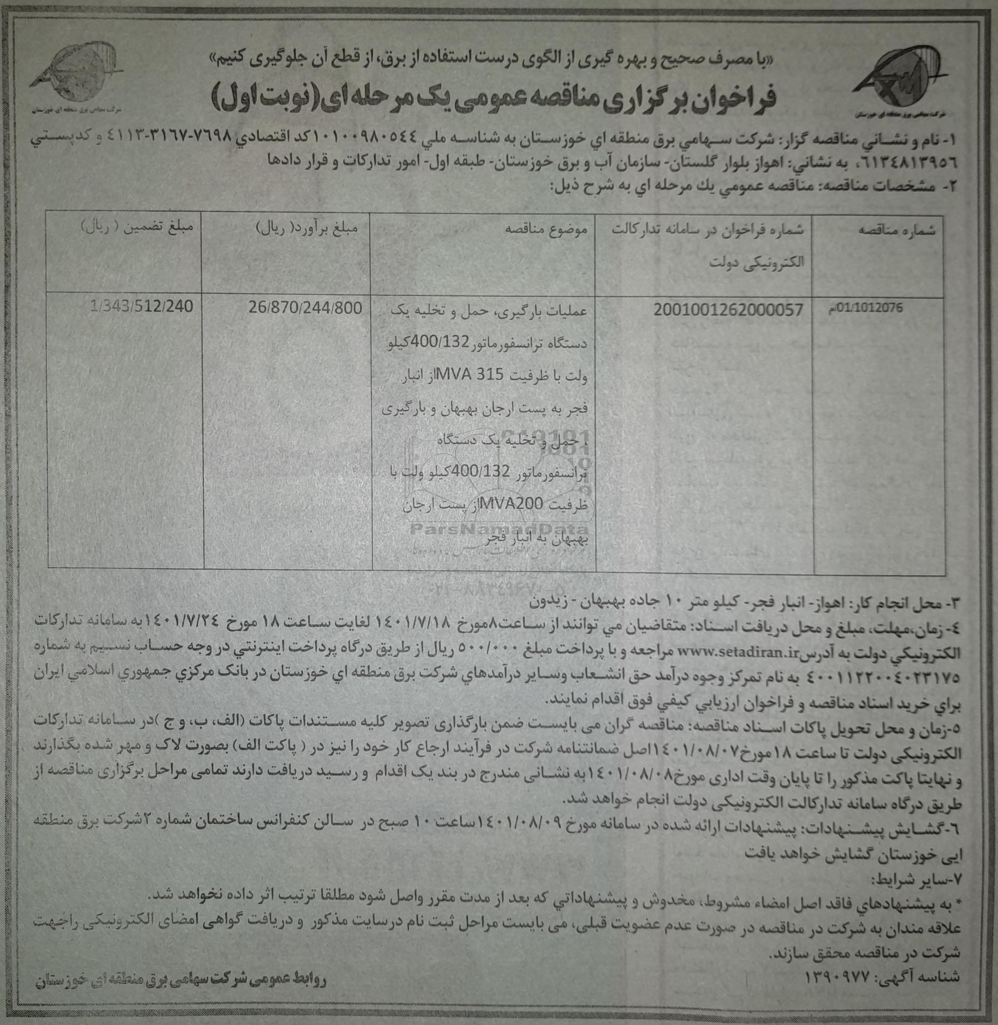 | 00/1012076/م | 2001001262000057 | عملیات بارگیری ، حمل و تخلیه یک دستگاه ترانسفورماتور 400.132 کیلوولت با ظرفیت mva315 از انبار فجر به پست ارجان بههبان و بارگیری حمل و تخلیه یک ذستگاه ترانسفورماتور 400.132 کیلوولت با ظرفیت mva200 از پست ارجان بهبهان به انبار فجر | 26.870.244.800 | 1.343.512.240 |