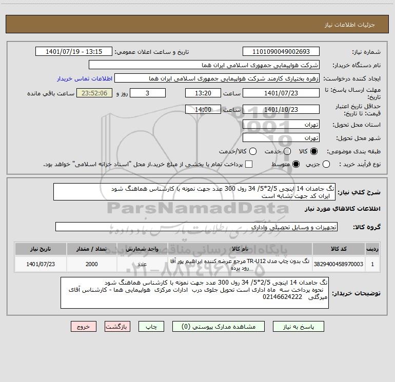 توضیحات خریدار:تگ جامدان 14 اینچی 2/5*5/ 34 رول 300 عدد جهت نمونه با کارشناس هماهنگ شود نحوه پرداخت سه ماه اداری است تحویل جلوی درب ادارات مرکزی هواپیمایی هما - کارشناس آقای میرگلی 02146624222