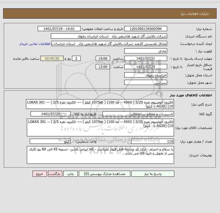 نام دستگاه خریدار:شرکت پالایش گاز شهید هاشمی نژاد استان خراسان رضوی