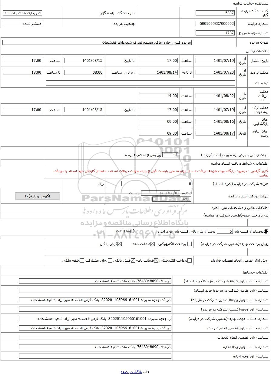 | شماره مورد اجاره | 5101005337000049 | نوع برگزاری مزایده | مزایده عمومی | |