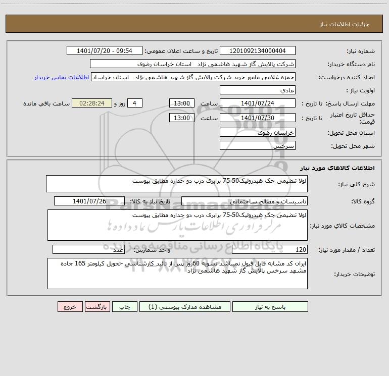 نام دستگاه خریدار:شرکت پالایش گاز شهید هاشمی نژاد استان خراسان رضوی