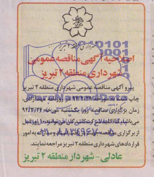 پیرو اگهی مناقصه عمومی شهرداری منطقه 2 تبریز چاپ شده در مورخ 94.2.29 در روزنامه مهد آزادی