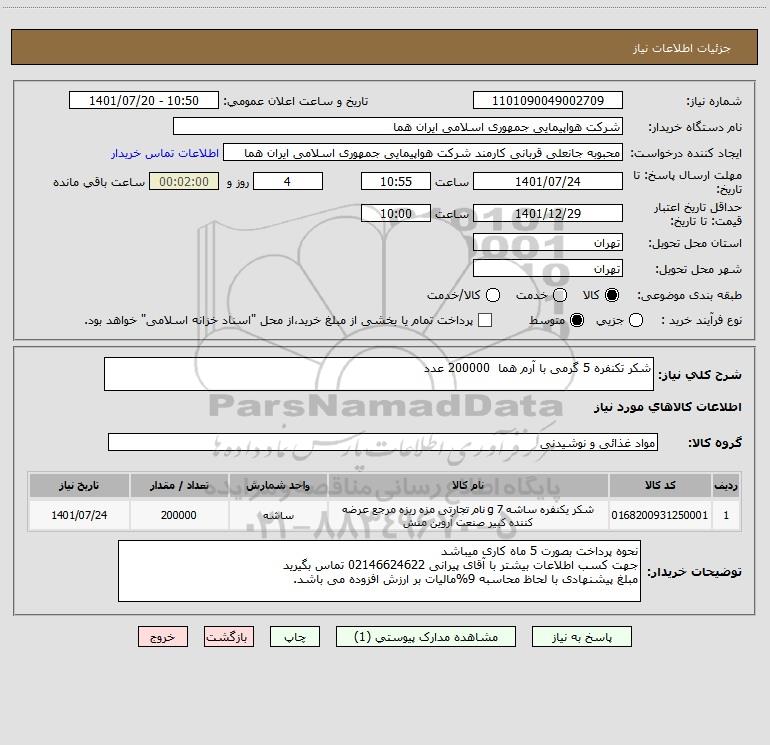 شرح کلی نیاز: شکر تکنفره 5 گرمی با آرم هما 200000 عدد
