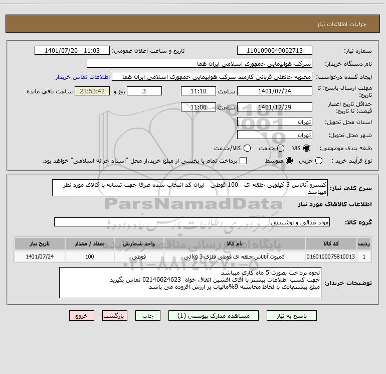 شرح کلی نیاز: کنسرو آناناس 3 کیلویی حلقه ای - 100 قوطی - ایران کد انتخاب شده صرفا جهت تشابه با کالای مورد نظر میباشد