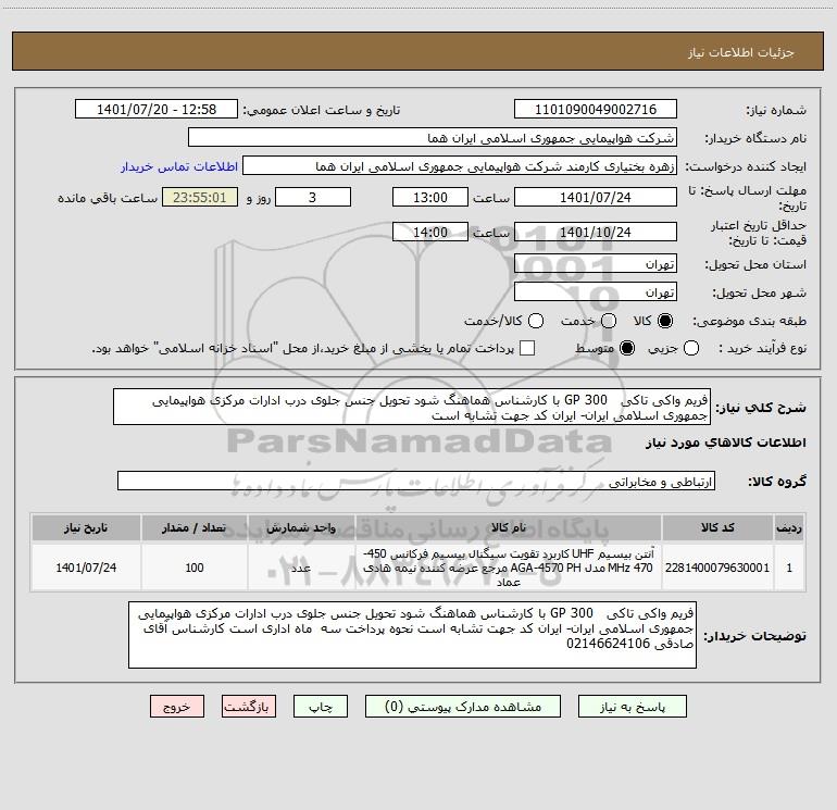 شرح کلی نیاز: فریم واکی تاکی GP 300 با کارشناس هماهنگ شود تحویل جنس جلوی درب ادارات مرکزی هواپیمایی جمهوری اسلامی ایران- ایران کد جهت تشابه است