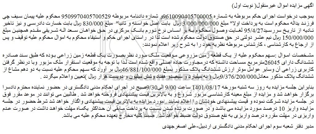 مشخصات اموال :سهم محکوم علیه از یک قطعه زمین مزروعی موقعیت ملک مورد نظربصورت یک قطعه زمین زراعی بوده که طبق سند صادره ششدانگ دارای 26045مترمربع مساحت داشته که درمجاورت جاده اصلی واقع شده است لذا با توجه به موقعیت استقرار ملک مزبور وبا درنظر گرفتن کاربری زراعی آن وسایر عوامل موثر ارزش ششدانگ پلاک مذکور بمبلغ 46/881/100/000ریال بر آورد که سهم محکوم علیه نسبت به دو دهم مشاع از ششدانگ پلاک مذکور معادل9/376/200/000ریال ( نه میلیارد و سیصدو هفتاد وشش میلیون و دویست هزار ریال )تعیین واعلام میگردد .