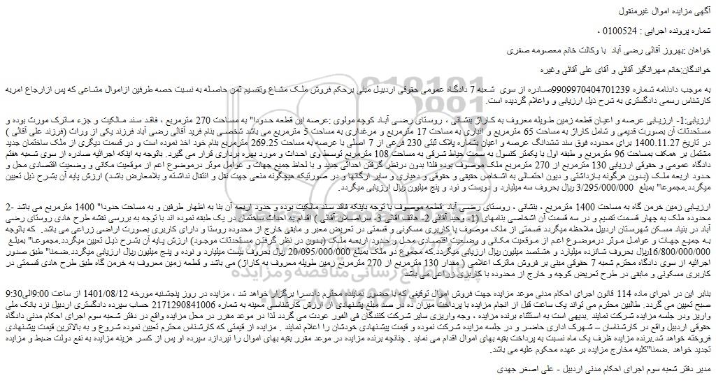 به موجب دادنامه شماره 9909970404701239صادره از سوی  شعبه 7 دادگاه عمومی حقوقی اردبیل مبنی برحکم فروش ملک مشاع وتقسیم ثمن حاصله به نسبت حصه طرفین ازاموال مشاعی که پس ازارجاع امربه کارشناس رسمی دادگستری به شرح ذیل ارزیابی و واعلام گردیده است.