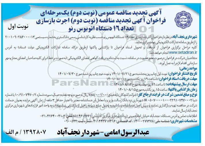 شهرداری نجف آباد درنظردارد فراخوان اجرت بازسازی تعداد 16 دستگاه اتوبوس رنو حسب نظریه کارشناسی رسمی دادگستری به شماره سیستمی 2001090286000013 را از طریق سامانه تدارکات الکترونیکی دولت برگزاری نماید