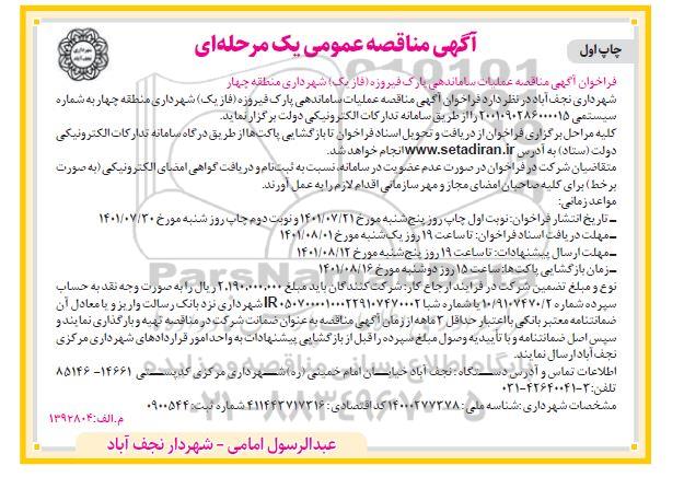 شهرداری نجف آباد در نظر دارد فراخوان آگهی مناقصه عملیات ساماندهی پارک فیروزه (فاز یک) شهرداری منطقه چهار به شماره سیستمی 2001090286000015 را از طریق سامانه تدارکات الکترونیکی دولت برگزاری نماید.