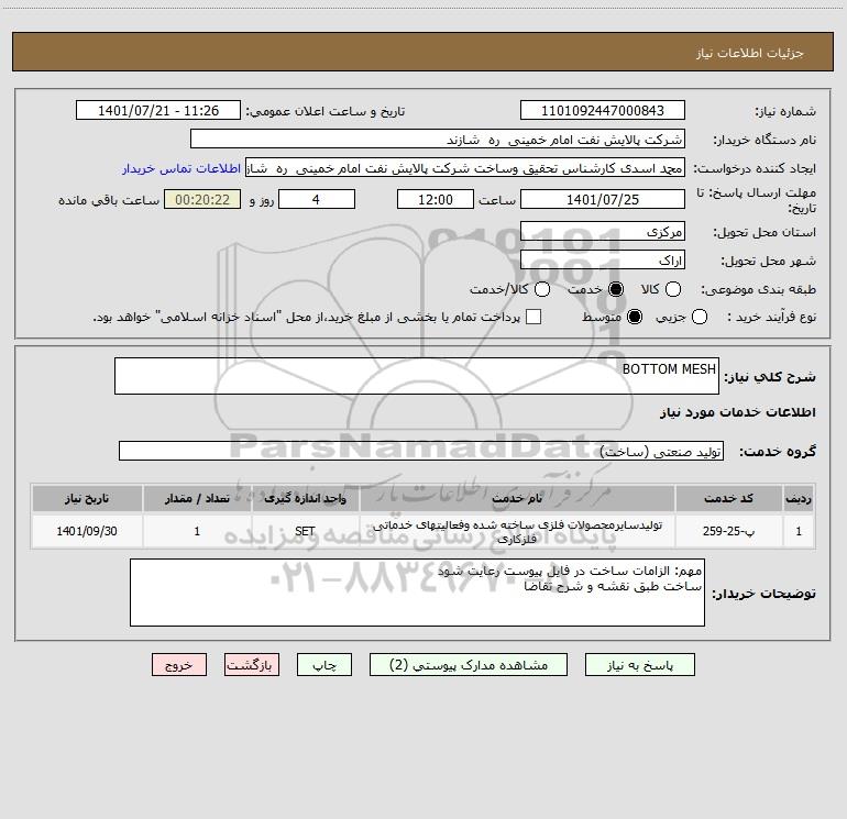 استعلام بها و موضوع استعلام استعلام BOTTOM MESH به اطلاع کلیه شرکتها و افراد متخصص واجد شرایط میرساند، آگهی گذار در نظر دارد از طریق استعلام بها، نسبت به انتخاب و دریافت پیشنهادات اقدام نماید. این استعلام با کد آگهی ثبت شده در سامانه خبرگزاری پارس نماد : 5025553 منتشر شده است. مشخصات استعلام : تاریخ شروع استعلام: 1401/07/21 آخرین مهلت ارسال پیشنهاد قیمت : 1401/07/25 و محل اجرای پروژه : استان مرکزی میباشد. استعلام قیمت مورد درخواست : استعلام BOTTOM MESH با دستهبندیهای تخصصی و گروه های مرتبط : خدمات صنعتی, سازه های فلزی و فضایی, تجهیزات نفت و گاز, تجهیزات و ماشین آلات صنعتی, استعلام اطلاع رسانی میگردد.
