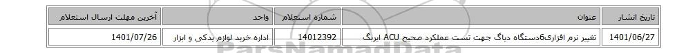 1401/06/27تغییر نرم افزاری6دستگاه دیاگ جهت تست عملکرد صحیح ACU ایربگ14012392اداره خرید لوازم یدکی و ابزار1401/07/26