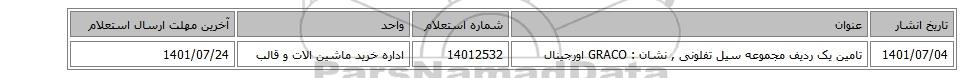 | 1401/07/04 | تامین یک ردیف مجموعه سیل تفلونی , نشان : GRACO اورجینال | 14012532 | اداره خرید ماشین الات و قالب | 1401/07/24 |