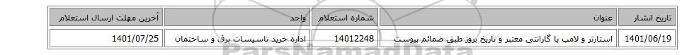 | 1401/06/19 | استارتر و لامپ با گارانتی معتبر و تاریخ بروز طبق ضمائم پیوست | 14012248 | اداره خرید تاسیسات برق و ساختمان | 1401/07/25 |