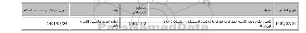 | 1401/07/04 | تامین یک ردیف کاسه نمد قاب فلزی با روکش لاستیکی , نشان : SKF اورجینال | 14012542 | اداره خرید ماشین الات و قالب | 1401/07/24 |