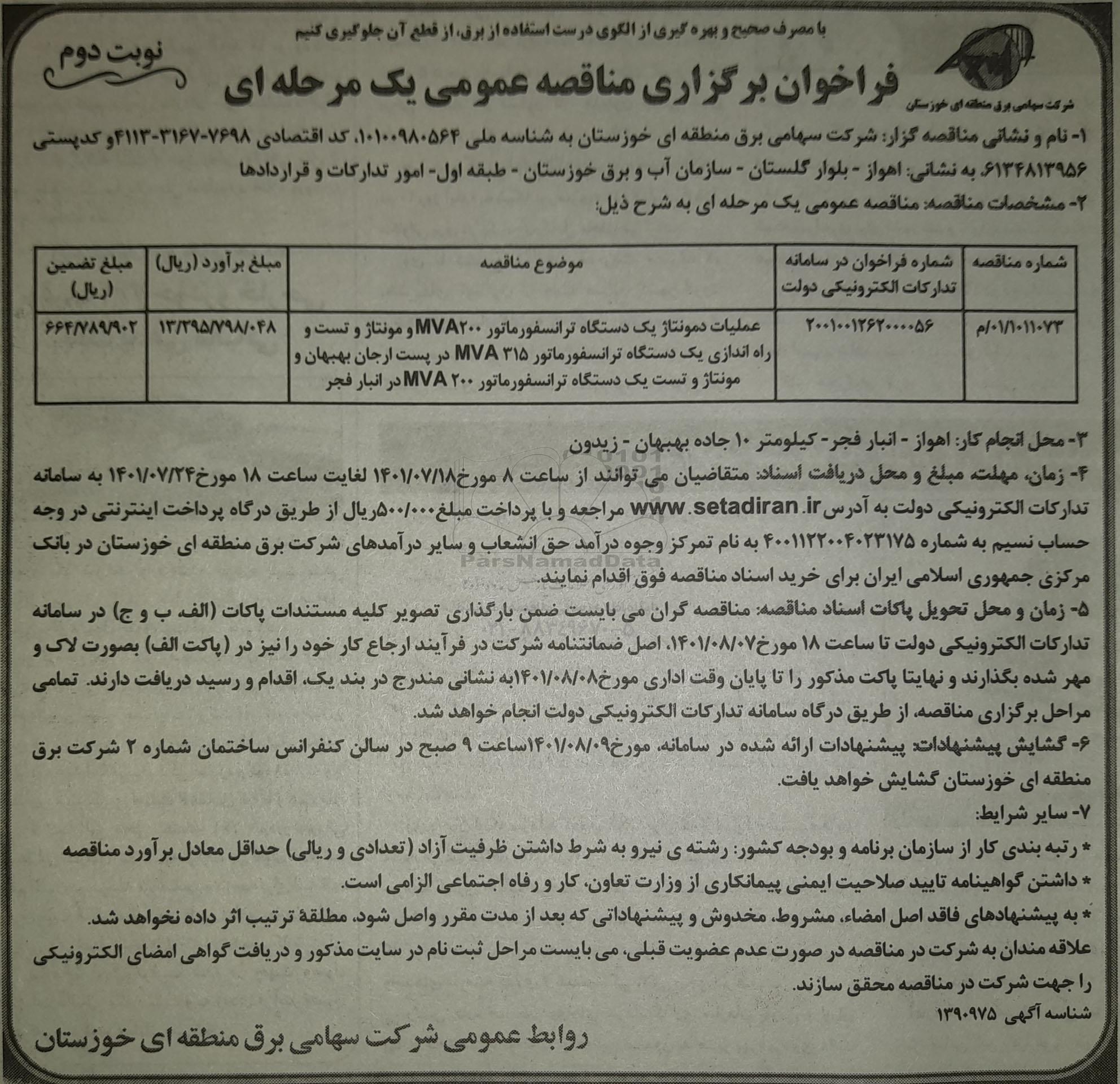 | 00/1011073/م | 2001001262000056 | عملیات دمونتاژ یک دستگاه ترانسفورماتور mva200 و مونتاژ و تست و راه اندازی یک دستگاه ترانسفورماتور mav315 nvدر پست ارجان بهبهان و مونتاژ و تست یک دستگاه ترانسفورماتور mva200 در انبار فجر | 13.295.798.048 | 664.789.902 |