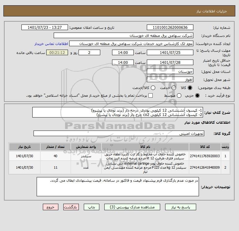 استعلام 1- کپسول آتشنشانی 12 کیلویی پودری درجه دار (برند توچال یا پیشرو) 2- کپسول آتشنشانی 12 کیلویی co2 چرخ دار (برند توچال یا پیشرو), استعلام 1- کپسول آتشنشانی 12 کیلویی پودری درجه دار (برند توچال یا پیشرو) 2- کپسول آتشنشانی 12 کیلویی co2 چرخ دار (برند توچال یا پیشرو)