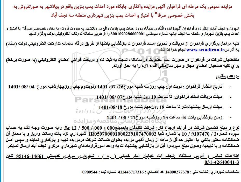 شهرداری نجف آباد در نظر دارد فراخوان آگهی مزایده واگذاری جایگاه مورد احداث پمپ بنزین واقع در ویلاشهر به صورت فروش به بخش خصوصی صرفا با امتیاز و احداث پمپ بنزین شهرداری منطقه 3 نجف آباد به شماره سیستمی 3001090286000001 را از طریق سامانه تداركات الكترونیكی دولت برگزار نماید.