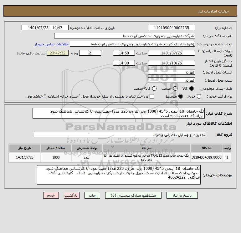 توضیحات خریدار:تگ جامدان 18 اینچی 5*45 (1000 رول هررول 225 عدد) جهت نمونه با کارشناس هماهنگ شود نحوه پرداخت سه ماه اداری است تحویل جلوی ادارات مرکزی هواپیمایی هما . کارشناس آقای میرگلی 46624222