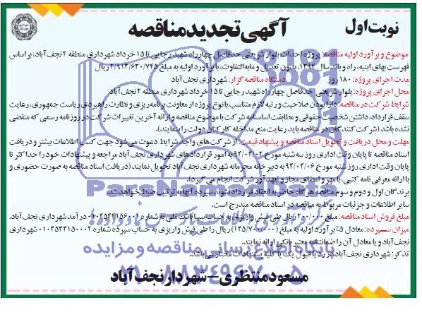 موضوع و برآورد اولیه مناقصه: پروژه احداث بلوار شریعتی حد فاصل چهارراه شهید رجایی تا 15 خرداد شهرداری منطقه دو نجف آباد بر اساس فهرست بها ابنیه راه و باند سال 94 بدون تعدیل و مابه التفاوت با برآورد اولیه به مبلغ 2.913.630.745 ریال