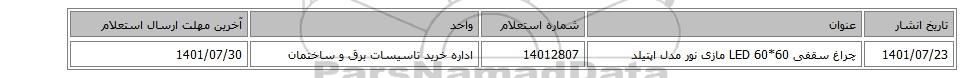 | 1401/07/23 | چراغ سقفی LED 60*60 مازی نور مدل اپتیلد | 14012807 | اداره خرید تاسیسات برق و ساختمان | 1401/07/30 |