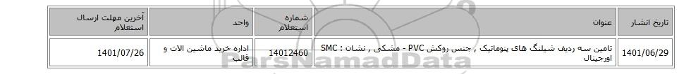 | 1401/06/29 | تامین سه ردیف شیلنگ های پنوماتیک , جنس روکش PVC - مشکی , نشان : SMC اورجینال | 14012460 | اداره خرید ماشین الات و قالب | 1401/07/26 |
