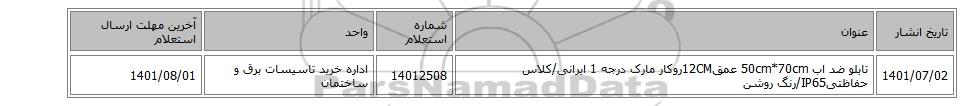 | 1401/07/02 | تابلو ضد اب 50cm*70cm عمق12CMروکار مارک درجه 1 ایرانی/کلاس حفاظتیIP65/رنگ روشن | 14012508 | اداره خرید تاسیسات برق و ساختمان | 1401/08/01 |