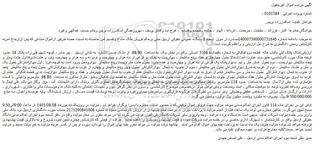 به موجب دادنامه شماره 140007390000731646صادره از سوی شعبه 8 دادگاه عمومی حقوقی اردبیل مبنی برحکم فروش ملک مشاع وتقسیم ثمن حاصله به نسبت حصه طرفین ازاموال مشاعی که پس ازارجاع امربه کارشناس رسمی دادگستری به شرح ذیل ارزیابی و واعلام گردیده است.