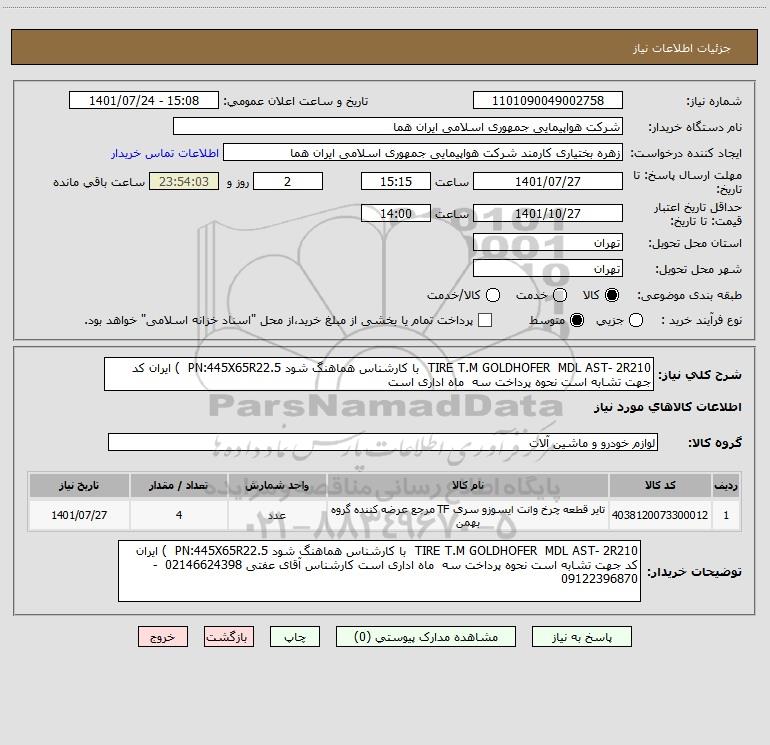 شرح کلی نیاز: TIRE T.M GOLDHOFER MDL AST- 2R210 با کارشناس هماهنگ شود PN:445X65R22.5 ) ایران کد جهت تشابه است نحوه پرداخت سه ماه اداری است