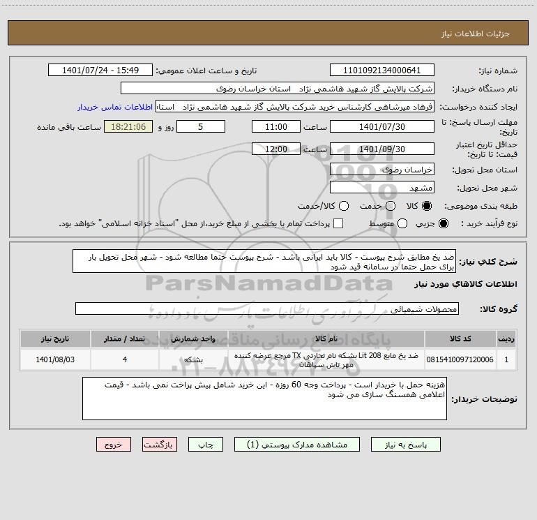 شرح کلی نیاز: ضد یخ مطابق شرح پیوست - کالا باید ایرانی باشد - شرح پیوست حتما مطالعه شود - شهر محل تحویل بار برای حمل حتما در سامانه قید شود
