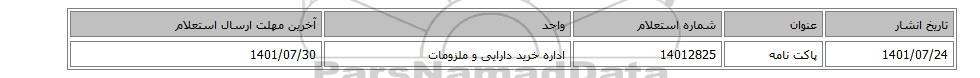 | 1401/07/24 | پاکت نامه | 14012825 | اداره خرید دارایی و ملزومات | 1401/07/30 |