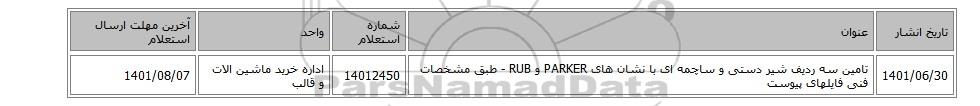 1401/06/30تامین سه ردیف شیر دستی و ساچمه ای با نشان های PARKER و RUB - طبق مشخصات فنی فایلهای پیوست14012450اداره خرید ماشین الات و قالب1401/08/07