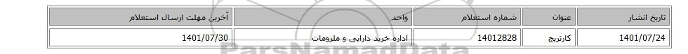 | 1401/07/24 | کارتریج | 14012828 | اداره خرید دارایی و ملزومات | 1401/07/30 |