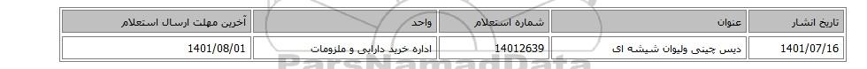 | 1401/07/16 | دیس چینی ولیوان شیشه ای | 14012639 | اداره خرید دارایی و ملزومات | 1401/08/01 |
