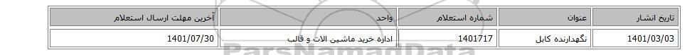 | 1401/03/03 | نگهدارنده کابل | 1401717 | اداره خرید ماشین الات و قالب | 1401/07/30 |