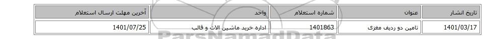 | 1401/03/17 | تامین دو ردیف مغزی | 1401863 | اداره خرید ماشین الات و قالب | 1401/07/25 |