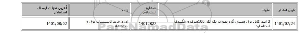 1401/07/243 ایتم کابل برق مسی گرد بصورت یک تکه 100متری و رنگبندی استاندارد14012827اداره خرید تاسیسات برق و ساختمان1401/08/02