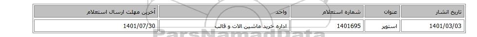 | 1401/03/03 | استوپر | 1401695 | اداره خرید ماشین الات و قالب | 1401/07/30 |