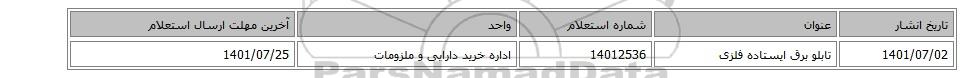 | 1401/07/02 | تابلو برق ایستاده فلزی | 14012536 | اداره خرید دارایی و ملزومات | 1401/07/25 |