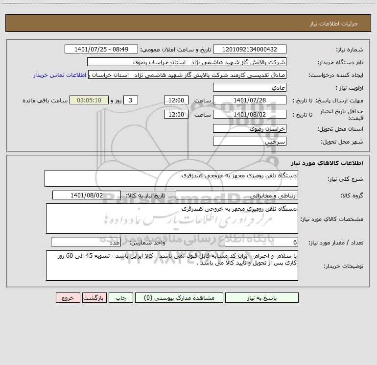 نام دستگاه خریدار:شرکت پالایش گاز شهید هاشمی نژاد استان خراسان رضوی