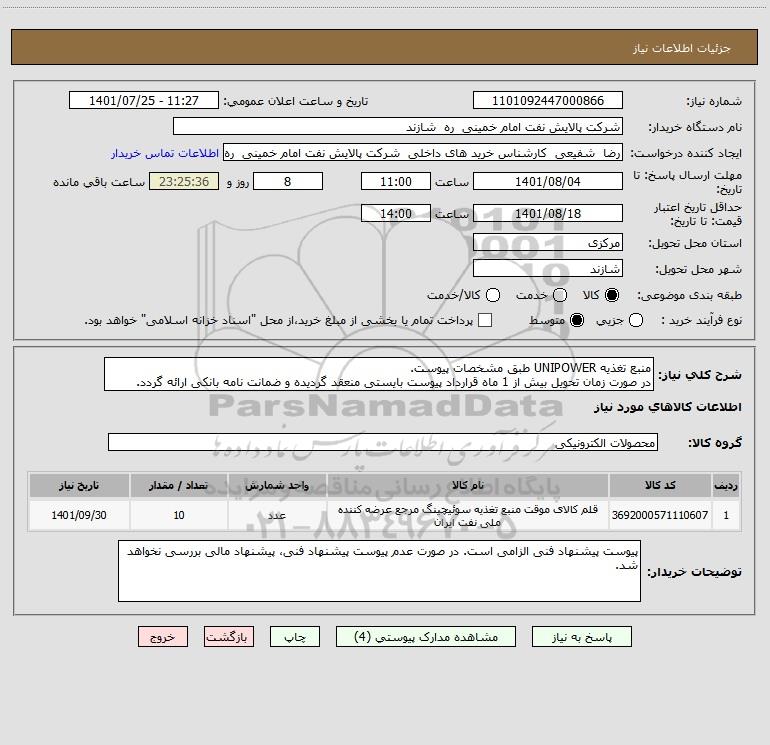 شرح کلی نیاز: منبع تغذیه UNIPOWER طبق مشخصات پیوست. در صورت زمان تحویل بیش از 1 ماه قرارداد پیوست بایستی منعقد گردیده و ضمانت نامه بانکی ارائه گردد.