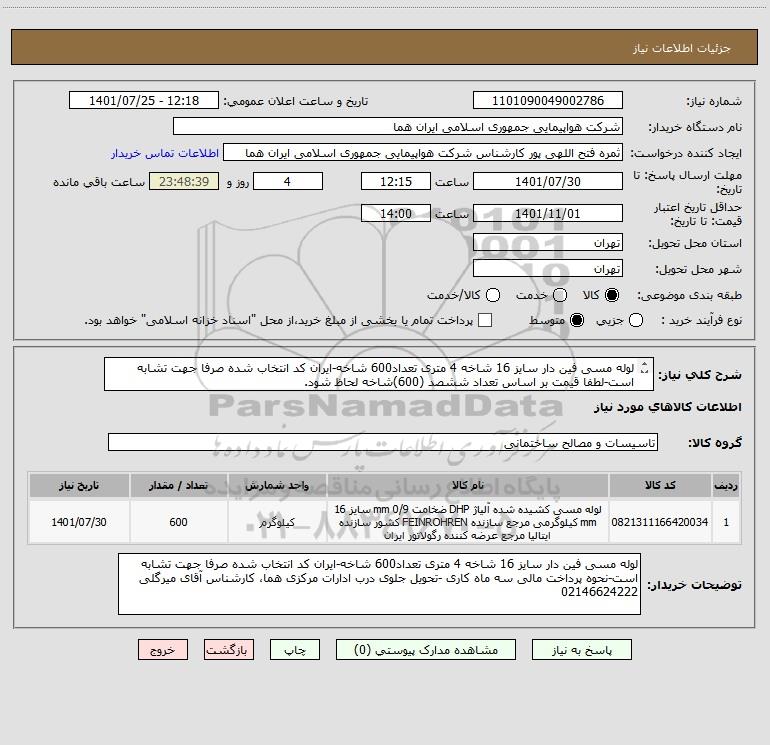 شرح کلی نیاز: لوله مسی فین دار سایز 16 شاخه 4 متری تعداد600 شاخه-ایران کد انتخاب شده صرفا جهت تشابه است-لطفا قیمت بر اساس تعداد ششصد (600)شاخه لحاظ شود.