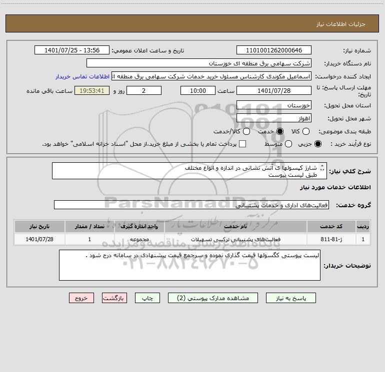 15 استعلام شارژ کپسول به شماره تقاضای 0400103 الزاما طبق شرح پیوست 9817528 1404/08/18 new not special not payed خوزستان