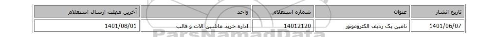 1401/06/07تامین یک ردیف الکتروموتور14012120اداره خرید ماشین الات و قالب1401/08/01
